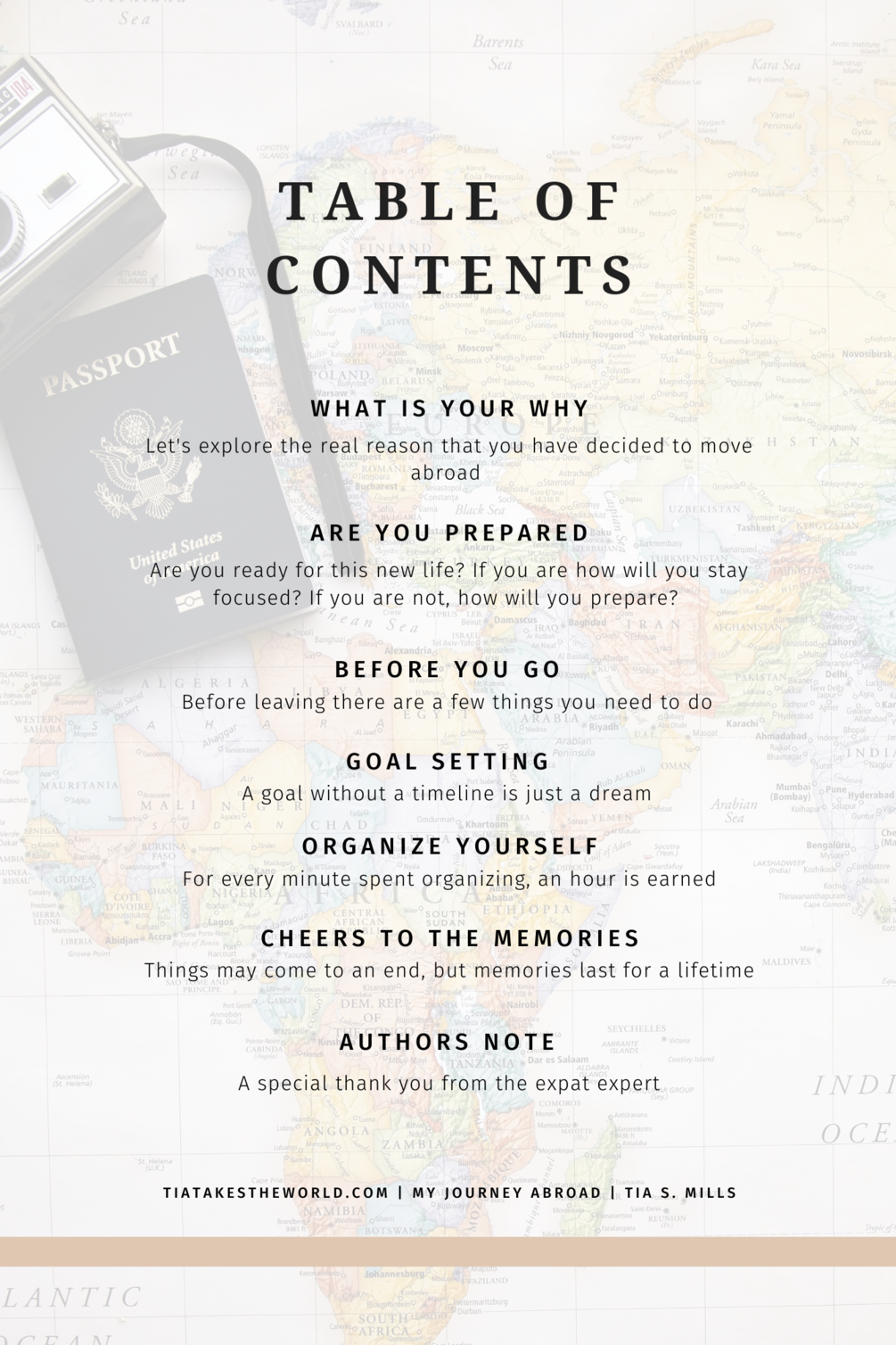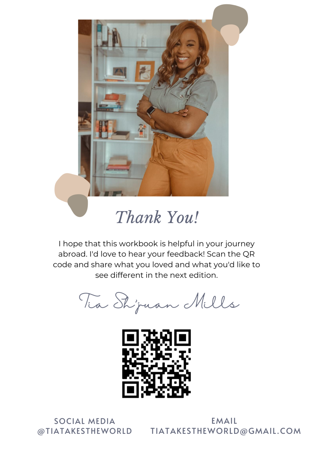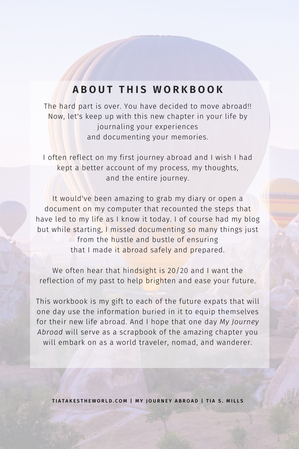 In this interactive digital journal you will get an opportunity to document your thoughts and feelings about moving abroad. The thought provoking activities in the workbook will cause you to be intentional about your goals and future abroad.
